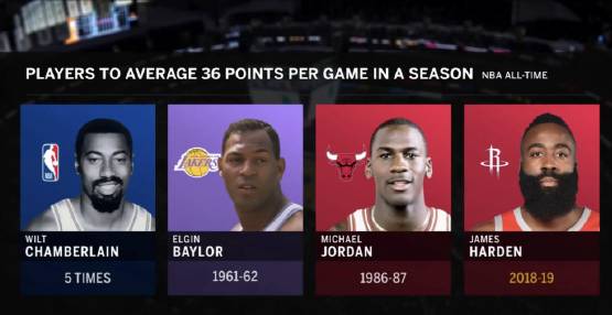 比赛间隙,电视转播商盘点了NBA有史以来做到过单赛季场均得分超过36分的球员,只有3人,分别是张伯伦(5次)、埃尔金-贝勒和乔丹。