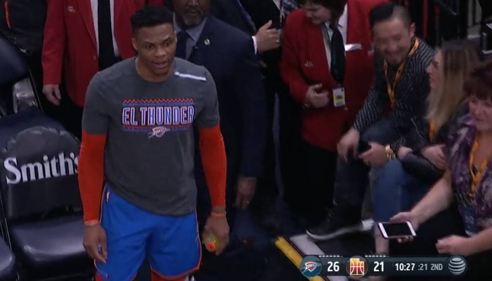 据名记Tim MacMahon报道,现场的爵士球迷与威少在口头上产生了不愉快的交流,爵士球迷冲着威少大喊:“威斯布鲁克烂透了!(Westbrook sucks)”