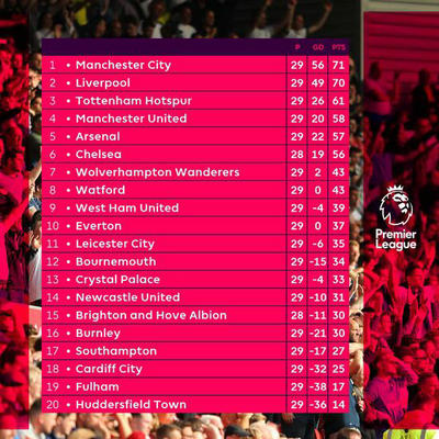 北京时间3月4日,2018-19赛季英超第29轮联赛战罢,英超积分榜也随之发生了变化。本轮联赛,利物浦在客场被埃弗顿逼平,遭遇英超客场三连平,遗憾的失去榜首。另外,曼城则1-0小胜伯恩茅斯,收获英超五连胜。目前,曼城的积分达到了71分,领先利物浦1分。争四方面,切尔西、曼联本轮全部取胜,阿森纳则战平热刺,争四大戏越演愈烈。